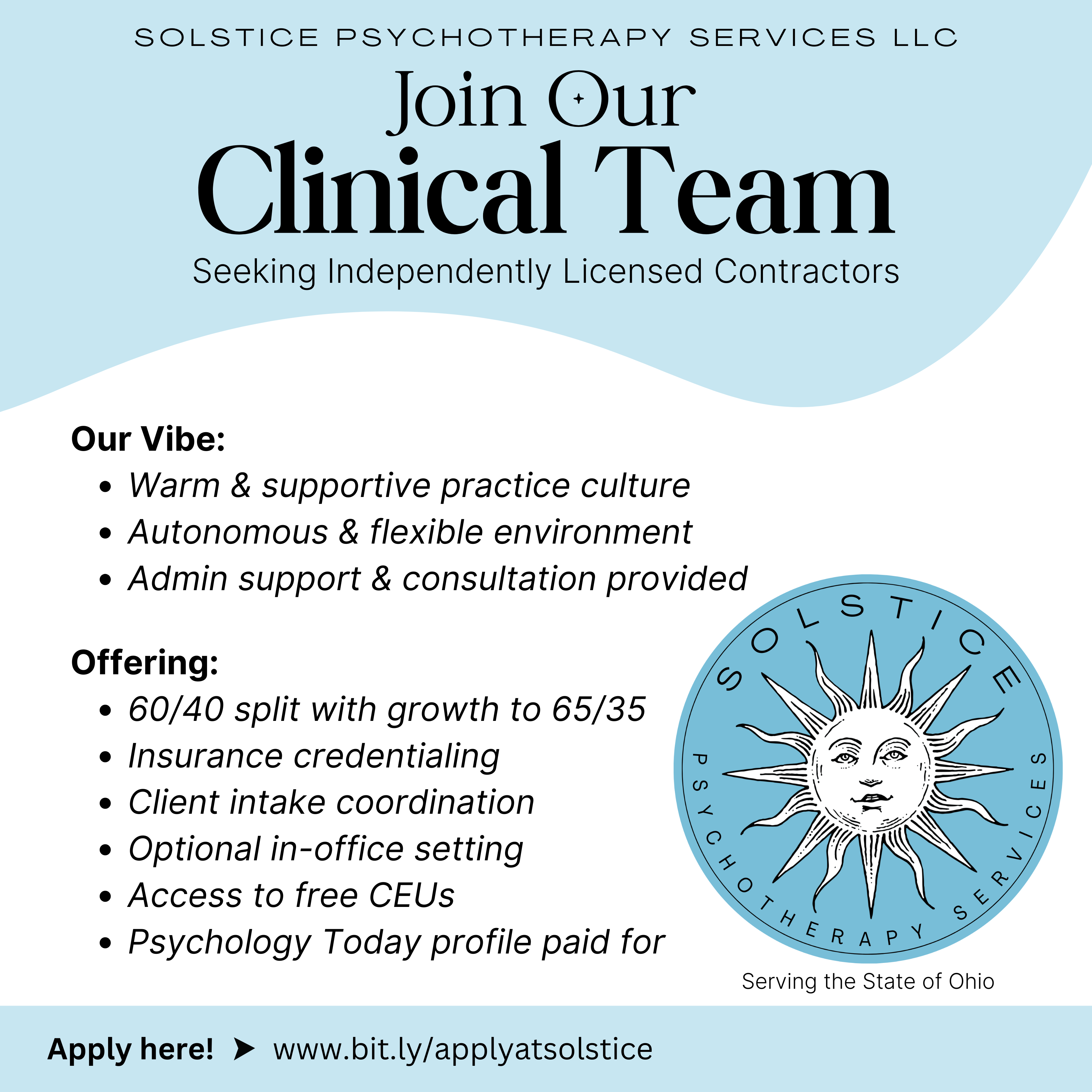 Solstice Psychotherapy Services is a growing group practice committed to thoughtful, ethical, and sustainable mental health care. Our model is designed for clinicians who value autonomy, professional trust, and supportive infrastructure, without micromanagement or productivity pressure.